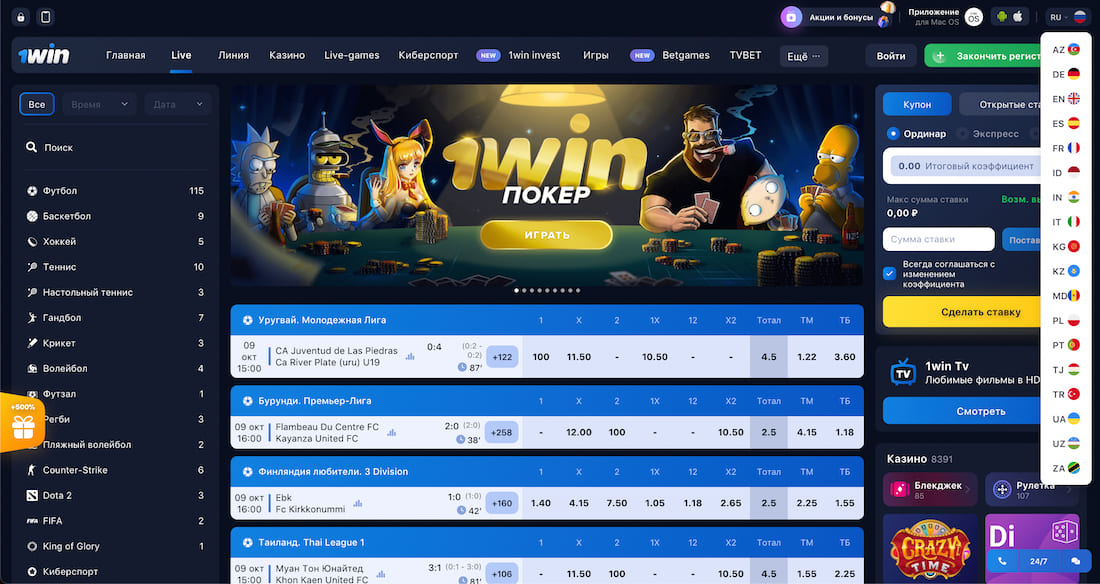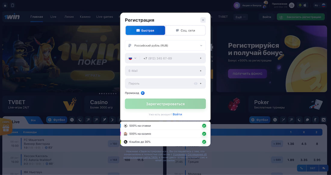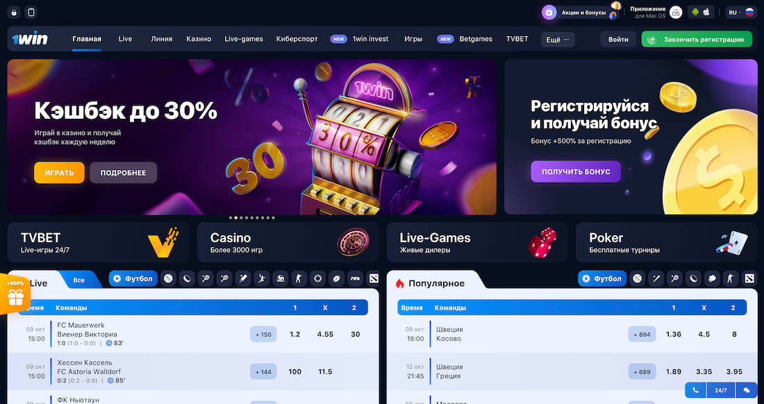 После регистрации перед вами откроются все функции 1 вин: ставки на спорт, казино онлайн, покер, баккара, турниры и акции.